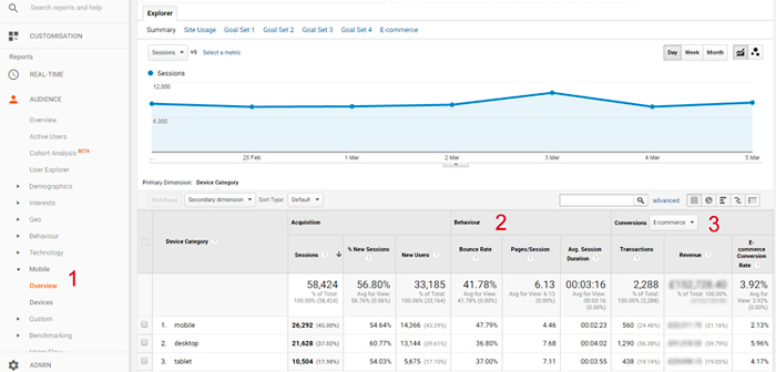 Given mobile internet users are higher than desktop your mobile experience needs to be better than desktop. There’s a report in the Audience section that quickly shows you how your mobile conversions measure up. The numbers below show you where to look.