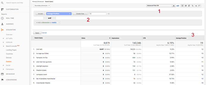 - Step 2. Sort the data to display all results with an average position of OVER 10. There are 10 results on a search engine result page (SERP), which means the 11th position is the first result on the second page.