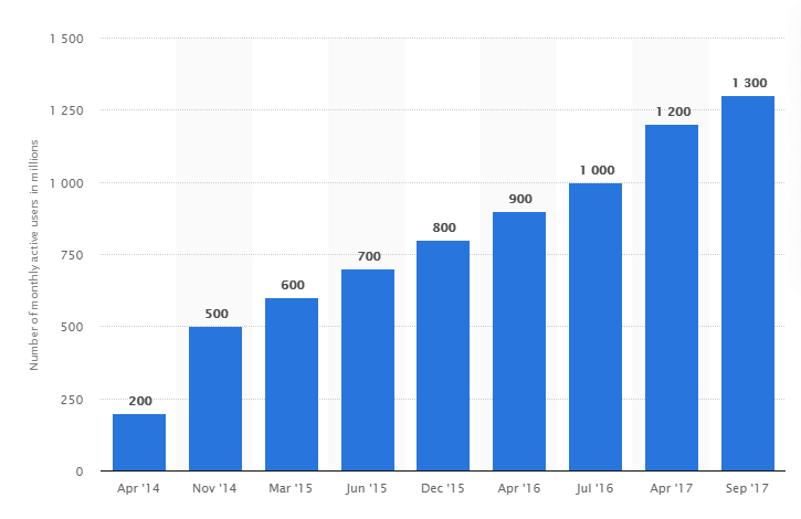 The diagrame below displays the number of monthly active Facebook Messenger users from April 2014 to September 2017(in millions)