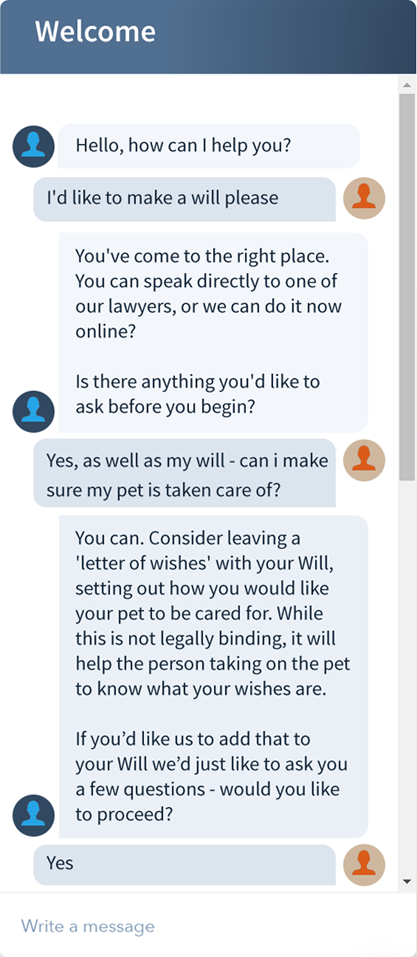 Rule based chatbots can’t offer a personised experience, for example if you gave a chatbot your name it won’t be able to remember it. As people inevitably use different grammatical structures, rule based chats breakdown. For example when a client wants a Will, they may say, “I want to start a new Will,” another client may use a different grammatical structure, “I need Will for myself.” We as humans understand both requests but a rule based chatbot can’t work that out and then has to pass the chat to a lawyer that in turn frustrates your client.