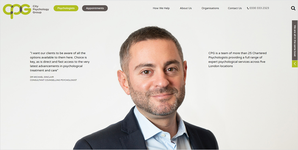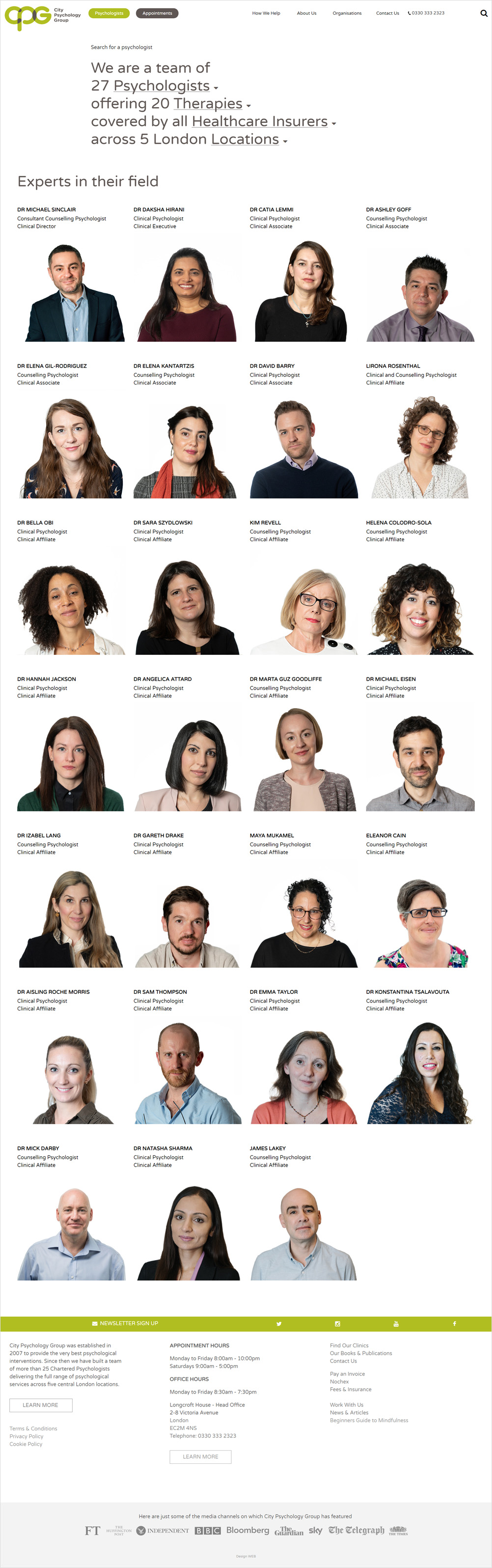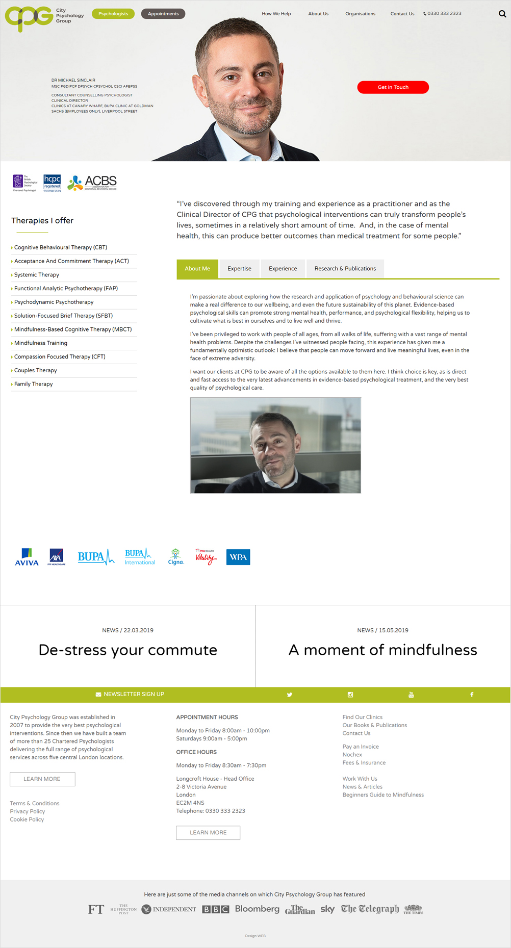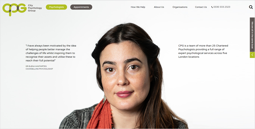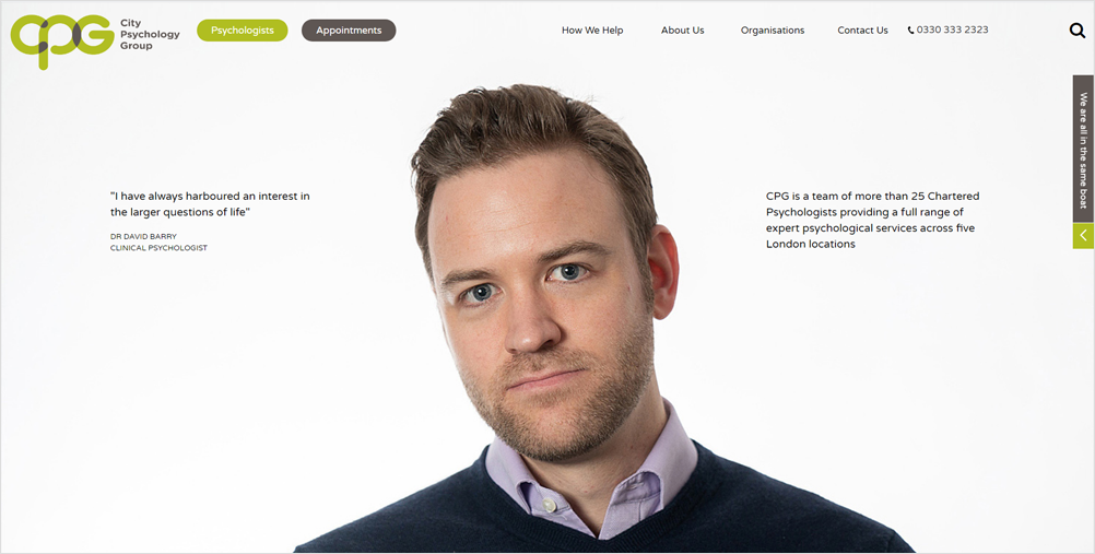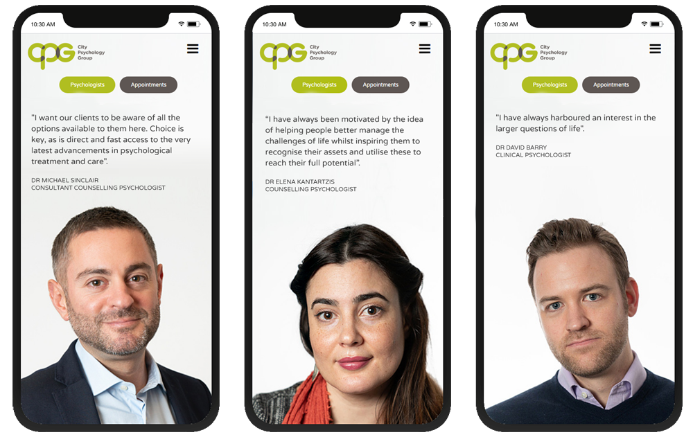As we guided CPG through the website design and website development process; we developed ideas around engaging users with portraits of psychologists in a style as if they already engaged in a session. We then combined this with powerful statements from each psychologist around why they do what they do to create an emotional connection.